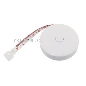 Huincha de Medir retráctil. Medidas Ø 5 cm. huincha métrica de 1,5 m. Plástico. con botón de bloqueo que permite marcar medida y liberar cinta. Escala de medida en cm y pulgadas.
