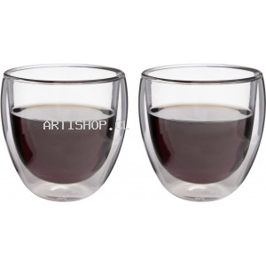 Set de dos vasos doble pared. Ø 8 x 8 cm. Capacidad 220 ml cada vaso. Vidrio. Apto para bebidas frías y calientes. Presentación en caja de regalo.