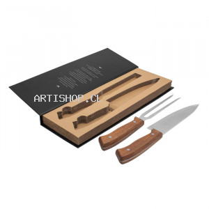Set de Asado. Tamaño:37,8 x 13 x 2,8 cm (caja cerrada). Acero inoxidable 420 y Madera de Acacia. Set de 2 utensilios: Cuchillo chef de 33,5 cm y 175 g. Tenedor de 31,3 cm y 125 g., ambos con mango de madera. Presentación en caja de regalo estilo libro.