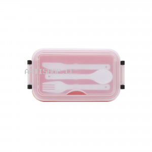 Lonchera Plástica. Tamaño; 11,5 x 5,8 x 21,5 cm. Plástico Polipropileno. Contenedor de alimentos. Tapa translúcida con bandeja porta cubiertos, anillo de silicona antiderrame y ajustes de seguridad en sus laterales. Set de 3 cubiertos plásticos de color blanco.
